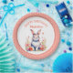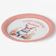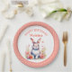 Ein süß-kleines Hasen umgeben von rosa und korallenfarbenen Blume Aquarell illustriert personalisierte Geburtstagsparty Papier Teller für ein kleines Mädchen.