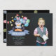 This cute boy's birthday photo invitation features a bunny rabbit looking out of a magician's hat with faux/fake gold stars, bunting flags, and colorful balloons in watercolor on a dark gray background. The reverse side features a black background with polka dots. Personalize for your needs. You can find more matching products at my store.