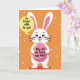 Designed with a cheerful, modern illustration style, this card features an upright white bunny 🐰 centered on a warm orange background dotted with small soft-white spots. Pink accents fill the long ears and warm the cheeks, while a wide smile and a friendly wink create a flirty, buddy-like connection with the viewer. Thin black whiskers and simple facial lines keep the look smooth and easy to read. The bunny hugs a large pastel-pink oval shape at chest level, like a sweet gift being offered with a knowing grin. Above the head, a rounded yellow speech bubble holds the main text in dark lettering, placed high and slightly to one side for balance. Additional smaller text sits on the pink oval in a darker contrasting color, reading clearly against the light surface 🌷. The orange field, white polka dots, yellow bubble, and pastel-pink oval form the full scene with the bunny standing front and center.