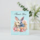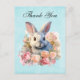 Thank you postcard with a watercolor image. A white gray bunny rabbit surrounded by a garland of pink and peach roses. For bunny lovers and Easter themes and birthdays and showers.