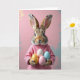 This design shows an upright rabbit-like character centered on a soft gradient background that shifts from pastel pink into muted blue, with gentle, diffused lighting that makes the fur look plush and touchable 🐰. The character wears a pale pink turtleneck sweater with fine knit texture, and its slightly tilted head and steady gaze create a tender, friendly connection with the viewer. In its furry paws, it cradles three smooth egg-shaped objects like treasured gifts, held close as if being offered with quiet affection 🌷. The eggs are colored goldenrod, soft pink, and light blue, each finished with tiny gold speckles that catch the light. Large, dark, reflective eyes and softly shaded ears add warmth, while the background stays uncluttered so the gentle pose reads like a small act of care. Any text would sit neatly near the top in a light cream or soft gold tone, with a smaller line near the bottom in pale pink to balance the colors. Behind the character, faint golden dots float on the pink side and hazy blue circles drift on the blue side.