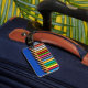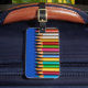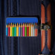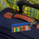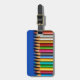 Bunte Bleistiftzeichenstifte auf blauem Gepäckanhänger