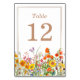 Die farbenfrohen Tischnummern der Wilden Blume Country Wedding bieten hübsche Blume in Orange, Gelb, lila und Rosa auf weißem Hintergrund mit der Tischnummer in der Mitte. Personalisieren Sie den Text in den Textfeldern, indem Sie ihn bearbeiten. Entwickelt für Sie von ©Evco Studio www.zazzle.com/store/evcostudio