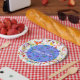 PapierTeller, der einen bunten Confettiwurf mit einem blauen Mittelkreis kennzeichnet, um irgendeinen Text hervorzuheben. Füllen Sie das Schablonenfeld mit Ihren Wörtern aus, entfernen Sie den Text und Kreis oder Klicken fertigt ihn besonders an! um eine Schriftartart vorzuwählen, ziehen Größe und Sie zu färben es vor.