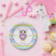 Niedliche lila Eule eingefaßt mit bunter Zickzackmuster Baby-Duschen-Platte. Sie können Text und "Babyparty" Bild entfernen und Ihre persönliche Information addieren.