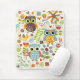 Eine Eule mit aquamarinem Kopf und Flügeln und goldener gelber Körper mit einem Blumenmuster in Rotem, in weißem und in aquamarinem. Zweite ist aquamariner Kopf und Körper mit roten Flügeln wings mit hellem beige Muster und das dritte man ist Schokolade brwon Kopf und Körper mit goldenen Flügeln mit den roten und aquamarinen Mustern. Der Hintergrund werden mit Blumen im Rot, in goldenem gelbem aquamarinem und in den Herzen im roten, aquamarinen und goldenen Gelb gefüllt. 2 Vögel sind im goldenen gelben und aquamarinen Körper mit schokoladenbraunem und im Rot mit hellen beige und aquamarinen Mustern auf Flügeln. Auch es gibt Kreismuster in der hellen Beige im Hintergrund. Dieses ist eine digitale Illustration.