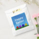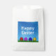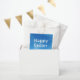 Happy Oaster Illustration mit bunten bemalten Ostereiern im Gras mit dem blauen Himmel im Hintergrund und "Happy Oaster" Typografie mit weißen Wolken.