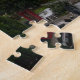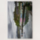 Puzzle des Fotos mit den bunten Fischereihafenhäusern von Portree Stadt, mit Reflexion im ruhigen Wasser des Meeres auf der Insel von Skye in Schottland, Großbritannien.