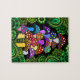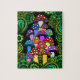 Ein Puzzle mit den bunten psychedelischen Pilzen umgeben durch grünes Paisley und grünen Mandalas.