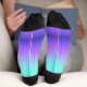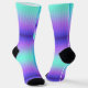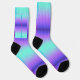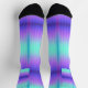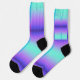 Bunte Socken mit einem Farbverlauf von Blau über Lila bis Türkis, mit schwarzen Zehen und Bündchen, liegen flach auf einem weißen Hintergrund.