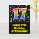 Die Front dieses Aufregens, Spaßes und vibrierenden GeburtstagsgrußkartenAusrüstungsbeschreibungen ein bunter Stern formt Muster, zusammen mit der Nr. "17", ein mehrfarbiges Regenbogenspektrum wie Steigungsmuster, auf einem Schwarzes farbigen Hintergrund kennzeichnend. Die Front kennzeichnet auch eine Geburtstagsgrußmitteilung, einschließlich einen personalisierten aufnahmefähigen Namen. Die inneren Eigenschaften eine kundengebundene Geburtstagsgrußmitteilung oder konnten möglicherweise geklärt werden und verlassener freier Raum, wenn eine Mitteilung eigenhändig stattdessen geschrieben werden soll. Eine kundengerechte Geburtstagskarte so wäre möglicherweise eine Spaßweise, jemand siebzehnter Geburtstag zu bestätigen. [~Z0000348]