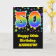 Die Front dieses Aufregens, Spaßes und vibrierenden GeburtstagsgrußkartenAusrüstungsbeschreibungen, die ein Muster des bunten Sternes formt, zusammen mit der Nr. "50", ein mehrfarbiger Regenbogen inspiriertes Spektrumsteigungsmuster, auf einem Schwarzes farbigen Hintergrund habend. Die Front kennzeichnet auch eine Geburtstagsgrußmitteilung, einschließlich einen kundengerechten aufnahmefähigen Namen. Die inneren Eigenschaften eine kundengebundene Geburtstagsgrußmitteilung oder konnten möglicherweise geklärt werden und verlassener freier Raum, wenn eine Mitteilung eigenhändig stattdessen geschrieben werden soll. Eine kundengerechte Geburtstagskarte so wäre möglicherweise eine Spaßweise, einer Mitteilung zur Feier jemand fünfzigsten Geburtstag zu schicken. [~Z0000348]