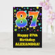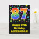 Die Front dieses Aufregens, Spaßes und vibrierenden GeburtstagsgrußkartenAusrüstungsbeschreibungen, die ein Muster des bunten Sternes formt, zusammen mit der Nr. "87", ein mehrfarbiger Regenbogen inspiriertes Spektrumsteigungsmuster, auf einem Schwarzes farbigen Hintergrund habend. Die Front kennzeichnet auch eine Geburtstagsgrußmitteilung, einschließlich einen personalisierten aufnahmefähigen Namen. Die inneren Eigenschaften eine kundenspezifische Geburtstagsgrußmitteilung oder konnten möglicherweise geklärt werden und verlassener freier Raum, wenn eine Mitteilung eigenhändig stattdessen geschrieben werden soll. Eine kundengerechte Geburtstagskarte so wäre möglicherweise eine Spaßweise, Geburtstagswünsche zu schicken jemand, das ihren Geburtstag des Siebtels achtzig feiert. [~Z0000348]