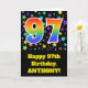 Die Front dieses Aufregens, Spaßes und vibrierenden GeburtstagsgrußkartenAusrüstungsbeschreibungen, die ein buntes Muster des Sternes formt, zusammen mit der Nr. "97", ein mehrfarbiges Regenbogenspektrum wie Steigungsmuster, auf einem Schwarzes farbigen Hintergrund kennzeichnend. Die Front kennzeichnet auch eine Geburtstagsgrußmitteilung, einschließlich einen kundengebundenen aufnahmefähigen Namen. Die inneren Eigenschaften eine kundengebundene Geburtstagsgrußmitteilung oder konnten möglicherweise geklärt werden und verlassener freier Raum, wenn eine Mitteilung eigenhändig stattdessen geschrieben werden soll. Eine personalisierte Geburtstagskarte so wäre möglicherweise eine Spaßweise, jemand neunzig Siebtelgeburtstag zu bestätigen. [~Z0000348]