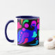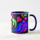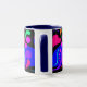 Das erste von 4 Tassen mit farbigen Griffen und Inneren. Der Entwurf auf diesem hat Herzen, Blasen und Wirbel in den mutigen, hübschen Farben auf einer schwarzen Platte. Der Griff und das Innere sind Marineblau.