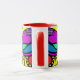 Das 3. in einer Reihe von 4 schön, bunte Tassen. Der Entwurf ist der Herzen, des Wirbel, der Punkte und mehr in hellem, Spaßfarben auf einer schwarzen Platte ein abstraktes. Der Griff und das Innere sind rot.