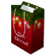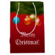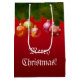 Teilen Sie Ihre Weihnachtsfreude mit geliebten zusammen mit dieser kundengebundenen Geschenktasche, die reich mit glänzenden Feiertagsverzierungen und grünes Douglas-Tanne auf einem roten Hintergrund verziert wird!