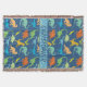 Dinosaurier-Silhouettemuster personalisiert. Tyrannosaurus Rex, titanosaurs, Triceratop, Raubvögel, Ankylosaurs, Dino-Vögel, Stegosaurus, Apatosaurus, Pteranodon und mehr in einem bunten Muster im blauen Hintergrund und Dinosaurier in Grünem, in Blauem, in Gelbem und Orange.