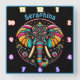 Ein majestätischer Elefant, reich mit aufwändigen Mustern und leuchtenden Farben dekoriert, steht stolz inmitten skurriler Elemente und strahlt Freude und Eleganz in einer spielerischen Feier des Lebens aus.