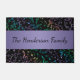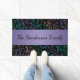 Bunter Musiknoten-personalisierte Fußmatte. Ein Muster der musikalischen Anmerkungen und der Clefs in einem Regenbogen von Farben auf Schwarzem (oder Ihrer Wahl der Hintergrundfarbe) und einem lila Band des Lavendels. Füllen Sie Ihren Familiennamen aus oder ändern Sie ihn zum Willkommen oder zu jedem möglichem Text Ihrer Wahl. Ein wunderbarer Eintritt für Ihr Zuhause oder Studio oder für Ihren Lieblingsmusiker- oder Musikliebhaber.