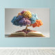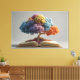 Ein majestätischer Baum entspringt den offenen Seiten eines antiken Buches, sein Stamm ragt in ein atemberaubendes Blätterdach aus flauschigen, juwelenfarbenen Wolken in Saphir, Amethyst, Magenta, Korallenrot, Goldgelb, Mintgrün und Rosé empor. Funkelnde Partikel schweben wie verzauberter Staub nach unten und verbinden die Magie des Geschichtenerzählens mit lebendiger Vorstellungskraft und grenzenloser Kreativität. Ideal für Leseecken, Kinderzimmer, Home-Office, Bibliotheken, Kinderzimmer, Kreativstudios oder als inspirierende Geschenke für Bücherliebhaber, Lehrer, Schriftsteller, Träumer, Eltern oder jeden, der glaubt, dass Geschichten Welten erschaffen.