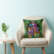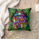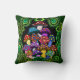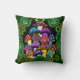 Ein Kissen mit den bunten psychedelischen Pilzen umgeben durch grünes Paisley und grünen Mandalas.