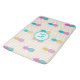 Diese hübsche personalisierte Badmatte kennzeichnet ein Muster der hellen Bilder der bunten Ananas auf einem gelben und weißen gestreiften Pastellhintergrund. Die Farben, die eingeschlossen sind, sind aquamarin, rosa, Gold und cerulean Blau. In der Mitte ist ein Doppeltes gezeichnete Kreisfahne mit Ihrem Monogramm im zusammenpassenden aquamarinen Aqua. Seien Sie sicher, die zusammenpassenden Wohngestaltungprodukte, einschließlich einen Duschvorhang, in unserem Speicher zu sehen.