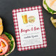 Casual "burgers & beer" engagement party invitations feature watercolor illustrations and a red and white gingham border. Perfect for summer or outdoor engagement parties, these casual chic invitations are easily customized with your celebration details.