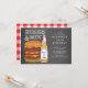 Moderne und lustige Chalkboard Burger & Bräu Barbecue Erwachsene Geburtstagsfeier mit einer Bierflasche mit einem großen Hamburger Set auf einem schwarzen Chalkboard Hintergrund und einem passenden roten Schachbrett zurück für eine besondere Touch .