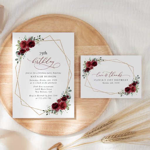 Mit dieser charmanten Geburtstagseinladung laden Sie Freunde und Familie in Stil und Set ein. Das Design ist bordeauxfarben mit Blume, Grün und Goldrahmen auf weißem Hintergrund.