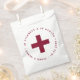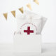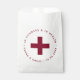 Für das Emergency Kit (alias Hangover Kit), um eine Hochzeit in Urlaubsort Begrüßungsbeutel, mit etwas Medikamenten in der Innenseite. Es hat ein Kreuz in der Mitte und einen gewölbten Text, der einen Kreis darum herum bildet. Oben ist die Nachricht "In Krankheit und in Gesundheit" und darunter sind die Namen der Braut und des Bräutigams und das Datum. Der Text ist in kleinen Kappen. Der Text und das Kreuz sind bordeauxrot, der Hintergrund weiß.