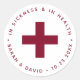 Ein Aufkleber für das Emergency Kit (alias Hangover Kit), um eine Begrüßungstasche in der Hochzeit in Urlaubsort zu stecken, mit etwas Medikamenten im Inneren. Empfohlen für eine Hochzeit, die bordeauxrot als Hochzeitsfarbe hat. Es hat ein burgundisches Kreuz in der Mitte und einen gewölbten Text, der einen Kreis darum herum bildet. Oben ist die Nachricht "In Krankheit und in Gesundheit" und darunter sind die Namen der Braut und des Bräutigams und das Datum. Der Text ist in kleinen bordeauxfarbenen Kappen.