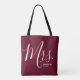 Ob eine neue Braut oder eine alte Ehefrau, sie wird diese Tasche Liebe. Der weiße Text ist auf Ihrem Monogramm, in Bordeaux, entworfen und alle sind Set über einem tieferen bordeauxfarbenen Hintergrund.Dieses Design beinhaltet nicht nur ein Monogramm, sondern auch ihren verheirateten Titel "Mrs.", ihren Namen und ihr etabliertes Jahr...personalisiert in dekorativer weißer Typografie. Sie wird Liebe zeigen, dass!