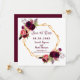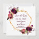 Eine elegante und romantische Hochzeit Speichern Sie die Date-Karte. Ein geometrisch geformter Rahmen in goldfarbenem Rahmen mit Bohemischen, boho-farbenen Rose, Blume in Bordeaux und Rosa. Vorlagen für Ihre Namen, Datum und Ort der Hochzeit. Weißer Hintergrund vorne. Briefe aus Burgund. Zurück: bordeauxfarbener Hintergrund.