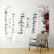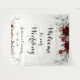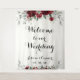 Ein bordeauxfarbenes Blumenschild Willkommen auf unserem Tapisserie-Zeichen, das Ihre Gäste zu Ihrer Hochzeit vor einem schwarzen Hintergrund mit weißem hübschem Schriftzeichen willkommen heißt.