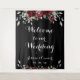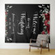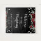 Ein bordeauxfarbenes Blumenschild Willkommen auf unserem Tapisserie-Zeichen, das Ihre Gäste zu Ihrer Hochzeit vor einem schwarzen Hintergrund mit weißem hübschem Schriftzeichen willkommen heißt.