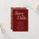Ein dunkelrotes oder bordeauxrotes, blassrotes Damast-Muster in Rose und für Ihre Hochzeit speichert die Daten. Der Save the Date Text ist ein schöner zeitgenössischer Kalligraphie-Stil. Der Hintergrund hinter dem Damast-Muster ist ein digital erweitertes Foto und nicht eine echte Rose goldene metallische Folie