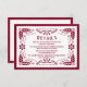Diese Umzäunungskarte mit Details für die Quinceañera-Feier zeichnet sich durch ein atemberaubendes mexikanisches Volkskunstdesign aus, das eine reiche Farbpalette aus Bordeaux und Weiß enthält. Das aufwändige Pikadomuster auf der Karte zeigt exquisite bordeauxfarbene Blume und verlasse Set vor einer unberührten, weißen Kulisse mit zarten, geschmolzenen Kanten.