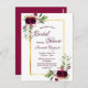 vorne: Ein weißer Hintergrund mit einem goldenen Rahmen für Imitate. Die Einrichtung ist mit dunkelbordeauxfarbenen Blume, Rose, bohischen Federn und Grünpflanzen gestaltet. Vorlagen für den Namen der Braut und die Einzelheiten des Party. Der Name und der Text: Brautparty werden mit handgeschriebenem Stift geschrieben, bugundy farbige Buchstaben. Zurück: Burgunder Hintergrund und Rose.