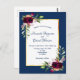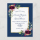 vorne: Ein marineblau-weißer Hintergrund mit einem goldenen Rahmen für Imitate. Die Einrichtung ist mit dunkelbordeauxfarbenen Blume, Rose, bohischen Federn und Grünpflanzen gestaltet. Vorlagen für Ihre Namen und Hochzeitsdetails. Die Namen werden mit handgeschriebenen Stilschriften, goldfarbenen Buchstaben geschrieben. Zurück: weißer Hintergrund und einige Blume.