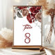 Elegantes burgunderrotes florales Hochzeitstisch Nummer mit schönen Blumen.