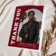 Stilvolle und trendige Abschluss-Dankeschön-Karte mit dem Foto des Absolventen auf der Vorderseite in einem Offset-Bogen Foto Rahmen. "Danke" wird in fett weißem Retrostil auf einem reichhaltigen bordeauxfarbenen Hintergrund gezeigt. Personalisieren Sie die Vorderseite dieses modernen Abschlusses dank Ihrer Karte mit dem Namen, Schule und Abschluss Jahr des Absolventen. Die Innenseite bietet Platz für eine benutzerdefinierte, typisierte oder handgeschriebene Nachricht, während die Rückseite über eine Collage aus drei Fotos verfügt - ideal, um die beliebtesten Erinnerungen des Abschlusses zu zeigen. Ideal für Absolventen der Highschool und der Uni.