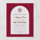Eine Budgetbat mitzvah Einladung. Auf einem bordeauxroten Hintergrund befindet sich ein weißer Bogen mit bordeauxfarbenem Text. Der Name ist in einem eleganten kalligrafischen Skript geschrieben. Über dem Text befindet sich ein bordeauxroter Stern von David.