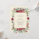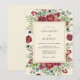 This design features a rich tapestry of deep red blossoms and variegated green foliage, accented with scattered dark berries. The artwork evokes a sophisticated, natural elegance, perfect for a refined autumnal or winter celebration. The lush botanical arrangement creates a captivating and organic border.