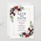 Die elegante Watercolor Burgundy Blue Floral Save the Date Verlobung Wedding Announcement Card beinhaltet bordeauxrote Rose, rosa Rosen, rote Rosen, blaue Blumen und botanisches Grün auf einem goldenen Rahmen.
