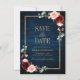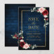 Aquarellbordeauxrot rot blütenrosa Blumenkarton Save the Date mit Goldrahmen und goldener Schrift mit grünem botanischem Blattwerk und Eukalyptus-Blätter im marineblauen Hintergrund. Dieses schöne, einfach zu anpassende Design kann leicht mit Ihren Hochzeitsfarben, Stilen und Thema übereinstimmen und ist die perfekte Wahl für Herbst- oder Winterhochzeiten. Sie können mehr passende Designs in meinem Shop finden oder kontaktieren Sie mich, wenn Sie Hilfe bei der Anpassung des Designs benötigen.