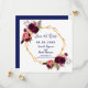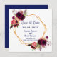 Eine elegante und romantische Hochzeit Speichern Sie die Date-Karte. Ein geometrisch geformter Rahmen in goldfarbenem Rahmen mit Bohemischen, boho-farbenen Rose, Blume in Bordeaux und Rosa. Vorlagen für Ihre Namen, Datum und Ort der Hochzeit. Weißer Hintergrund vorne. Marinebriefe Zurück: marineblau farbener Hintergrund.