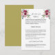Diese wunderschöne Gästekarte für Hochzeitsgäste wurde entworfen, um sich mit der Charlotte, Burgundy & Blush Blumenstrauß Wedding Collection abzustimmen. Charlotte ist eine wunderschöne, romantische und einladende Suite mit einem Aquarellbild von Rose. Diese einzigartige Designerkarte der Gast-Details verleiht Romantik und Eleganz. Fragen Sie, welche Informationen auf einer Hochzeitseinladung einfügen? Überlegen Sie Details wie z.B. alternative Hotelunterkünfte, Anfahrtsbeschreibung zum Veranstaltungsort, Geschenkideen und Ihre Hochzeitswebsite-URL. Sie können sogar eine Karte auf die Rückseite hochladen, indem Sie die Funktion Customize© Julie McIver benutzen