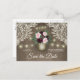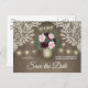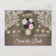 Burgund Blush Pink Gold Wedding Save the Date Postcards - mit einem rustikalen Stallholzhintergrund mit Elfenbeinspitze, Streichelleuchten und einem antiken goldenen Maurerkrug mit Grünpflanzen, Eukalyptus und Rose und Pionieren in Bordeaux- und Rosa-Rosa-Tönen. Ändern Sie die Demo-Initialen des Glases auf Ihre eigene. Sehen Sie sich die passende Auflistung auf dieser Seite an, um zu sehen, wie Produkte koordiniert werden.