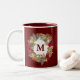 Moderner, Burgunder CELEBRATE JESUS Weihnachtskranz Zwei-Tone-Tasse mit individualisierbarem Text - vorne CELEBRATE JESUS und hinten ein MONOGRAM - das Sie mit Ihren eigenen Details personalisieren können. Es gibt eine subtile Fliesenbotschaft, die sagt: CHRISTMAS BLESSINGS. Passende Weihnachtsgeschenke und Wohngestaltung sind in der CHRISTMAS WREATH Kollektion von Berean Designs erhältlich.